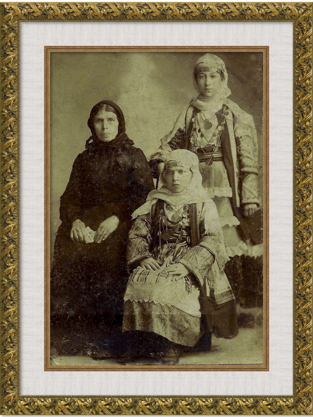Tentatively dated from around 1890, the three women in this cabinet portrait have been identified as Efrosini Venardos Chlentzos (1843-1935) and her daughters Kyrani and Maria, from the small village of Christoforianika on the island of Kythera. In 1869 Efrosini married Charalambos Chlentzos, an illiterate farmer and fisherman. Aged 18, he was eight years younger than her, something fairly unusual at the time; the birth of her first daughter, Kirani, shortly after the wedding may suggest an explanation. Charalambos was lost at sea sometime during the late 1870s, leaving Efrosini to bring up four children, two sons and two daughters, in extremely straightened circumstances; three of her children eventually emigrated to the United States, and it is to the descendants of Maria Chlentzos that we owe the survival of this photograph.