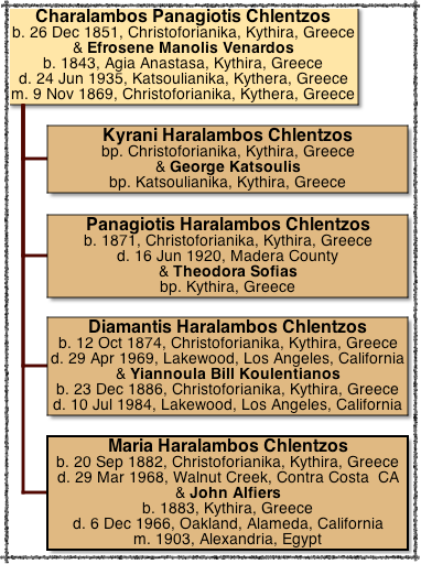 Efrosini & Charalambos had four children; Kirani, Panayiotis, Diamandis, and my grandmother Maria. Maria, Diamantis and Panayiotis immigrated to California. Kirani remained in Greece. Efrosini died on June 24, 1935 in Katsoulianika, Kythera.